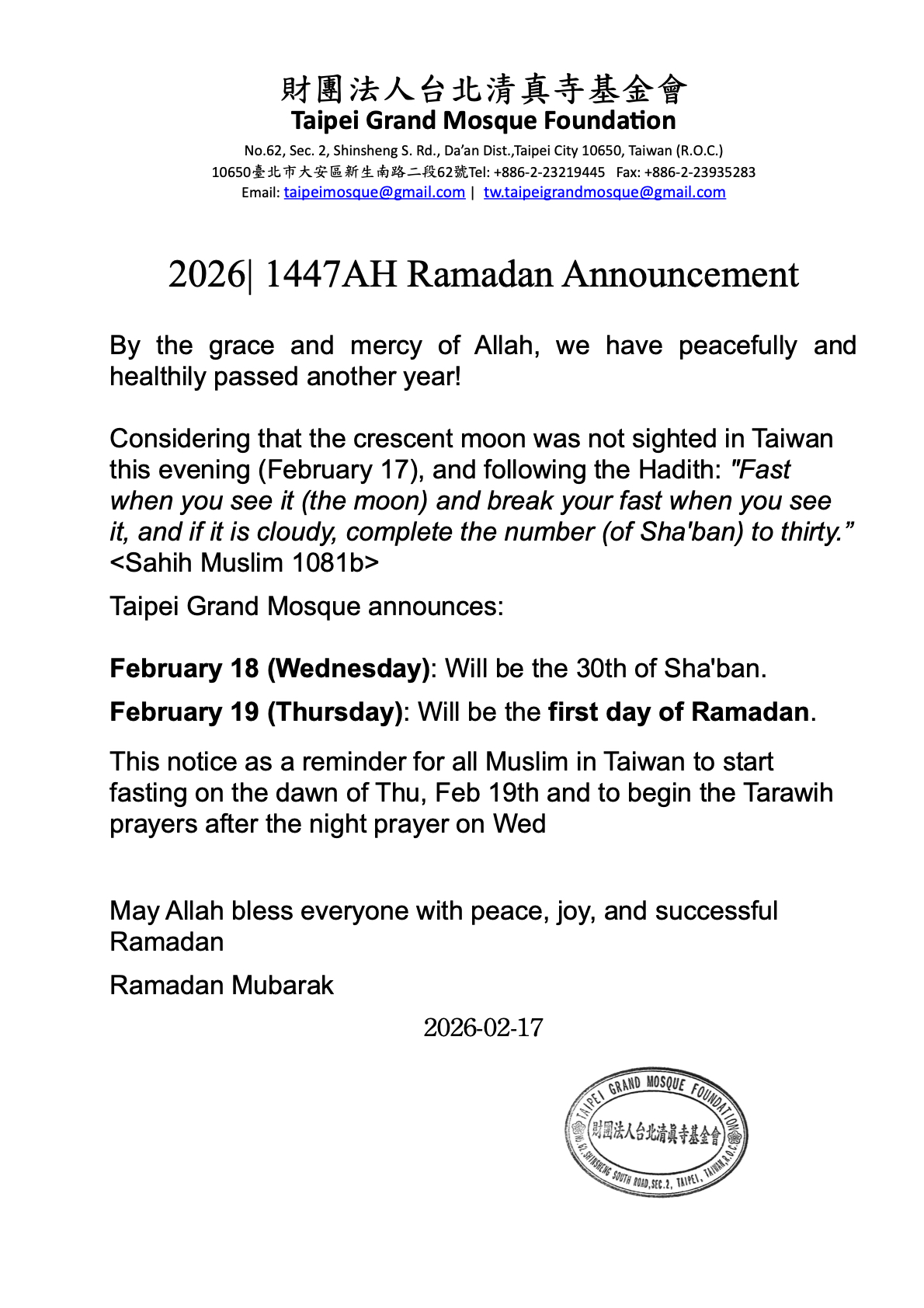Taipei Grand Mosque announces: