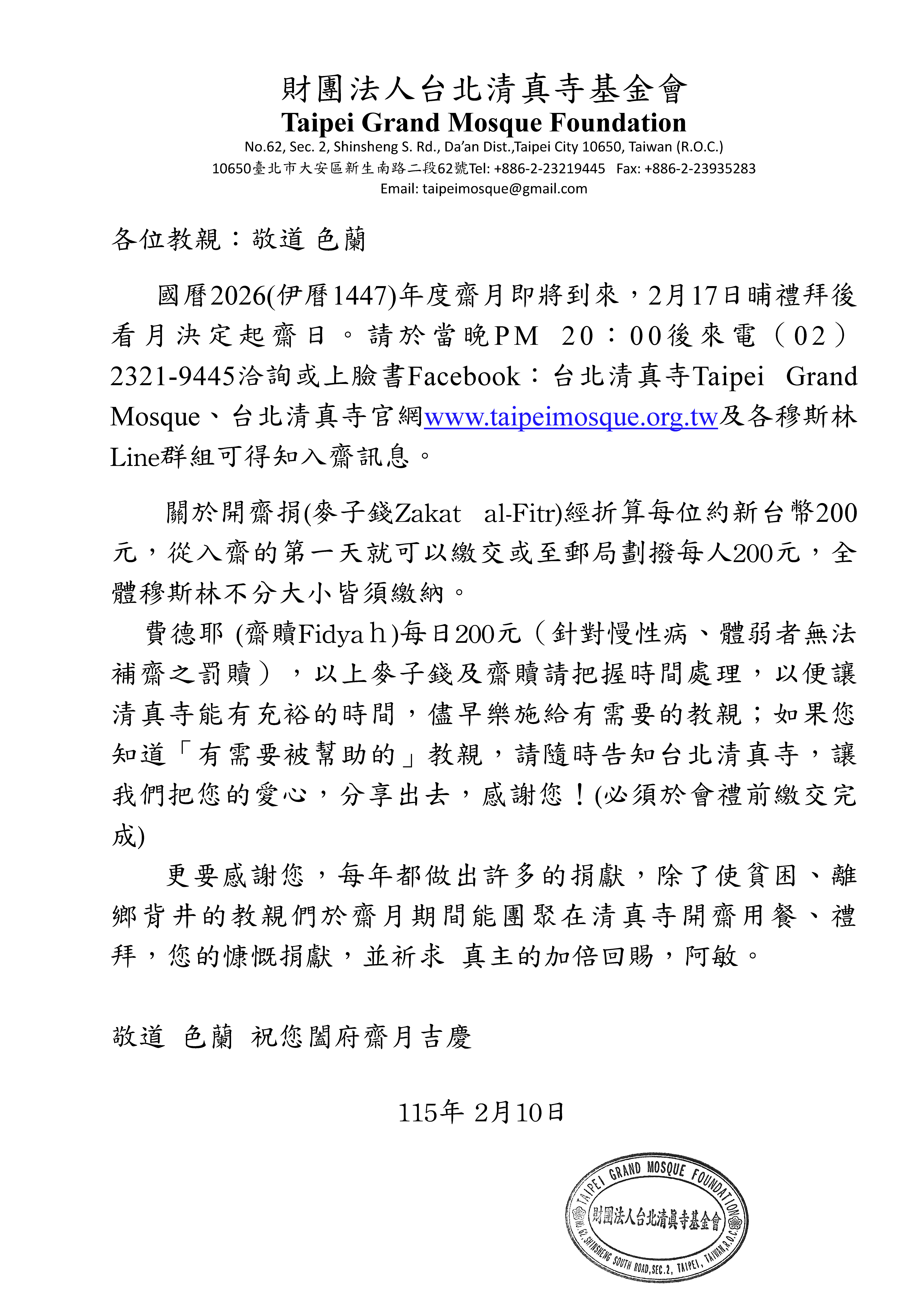 ☪️2026 (Hijri 1447) Ramadan Announcement: Taipei Grand Mosque