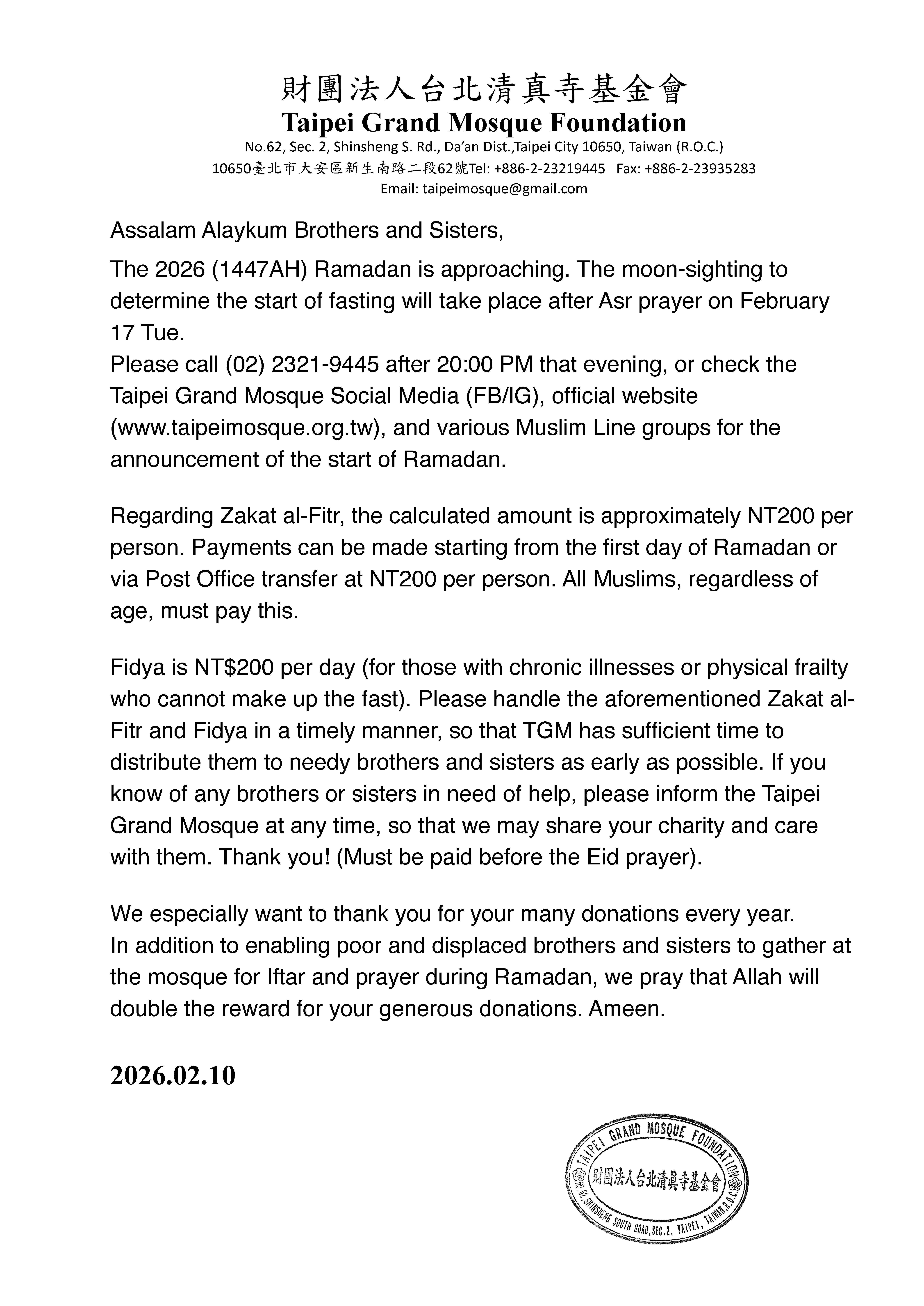 2月17日週二 晡禮拜 Asr 後看月決定起齋日。